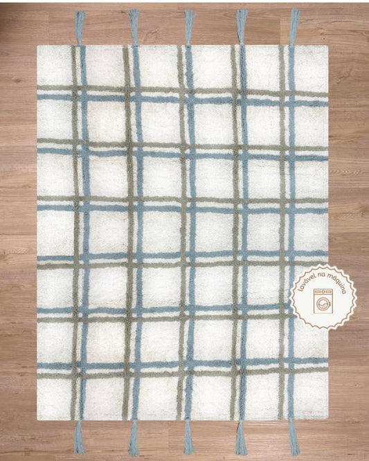 Tapete Lavável de Algodão Xadrez com Pompom Azul