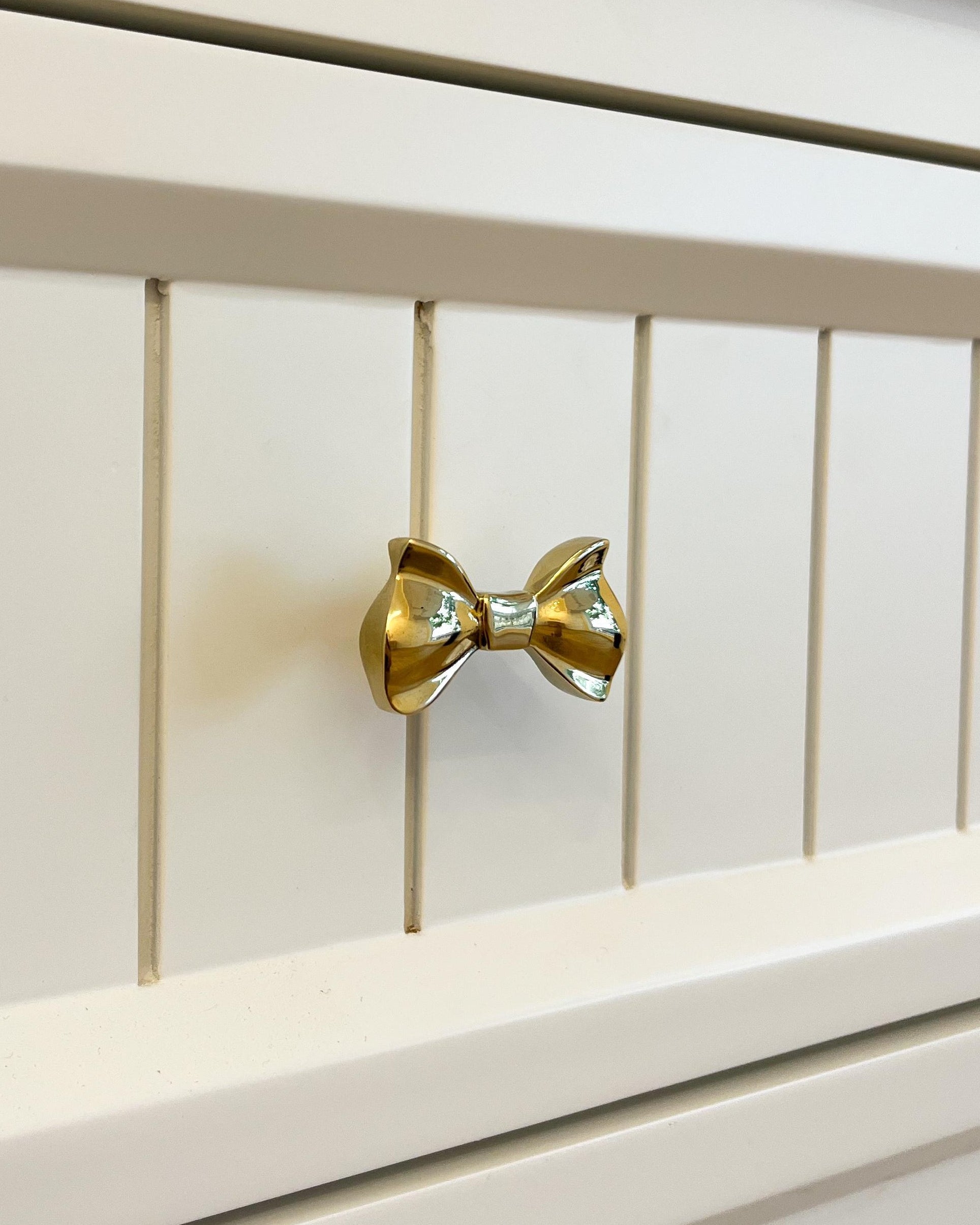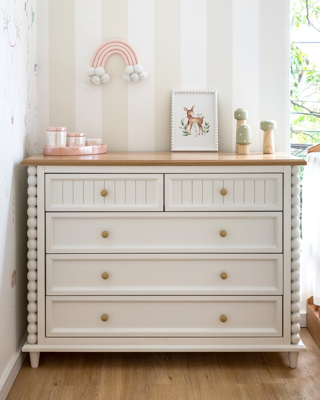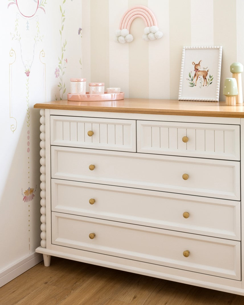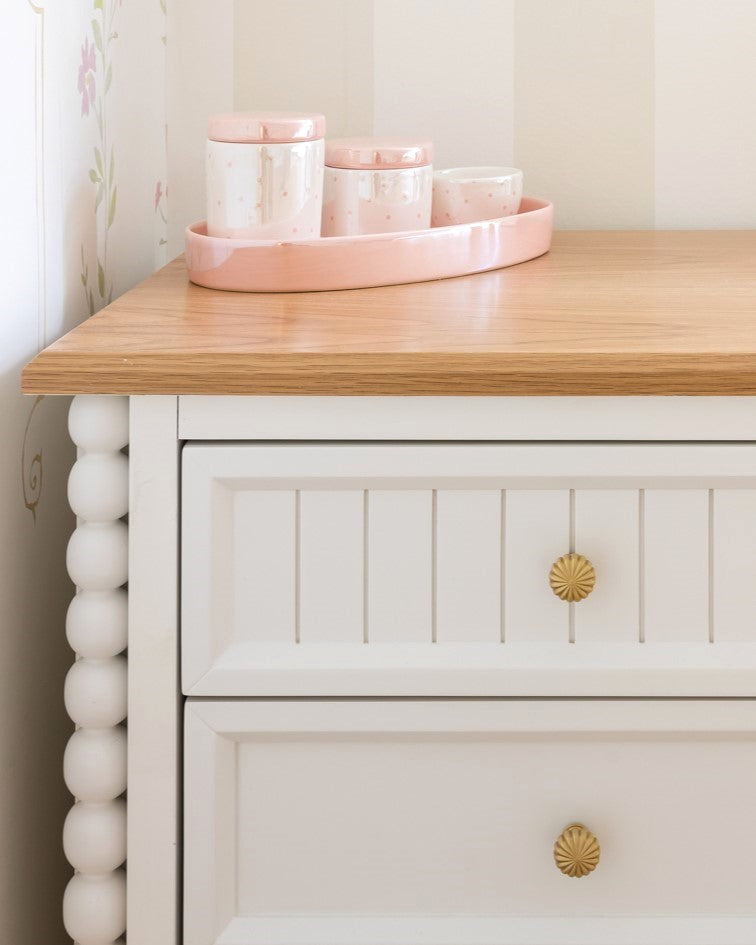 A cômoda e composta por quatro gavetas amplas, ideias para organização, cada uma adornada com puxadores florais que acrescentam um toque romântico e delicado.