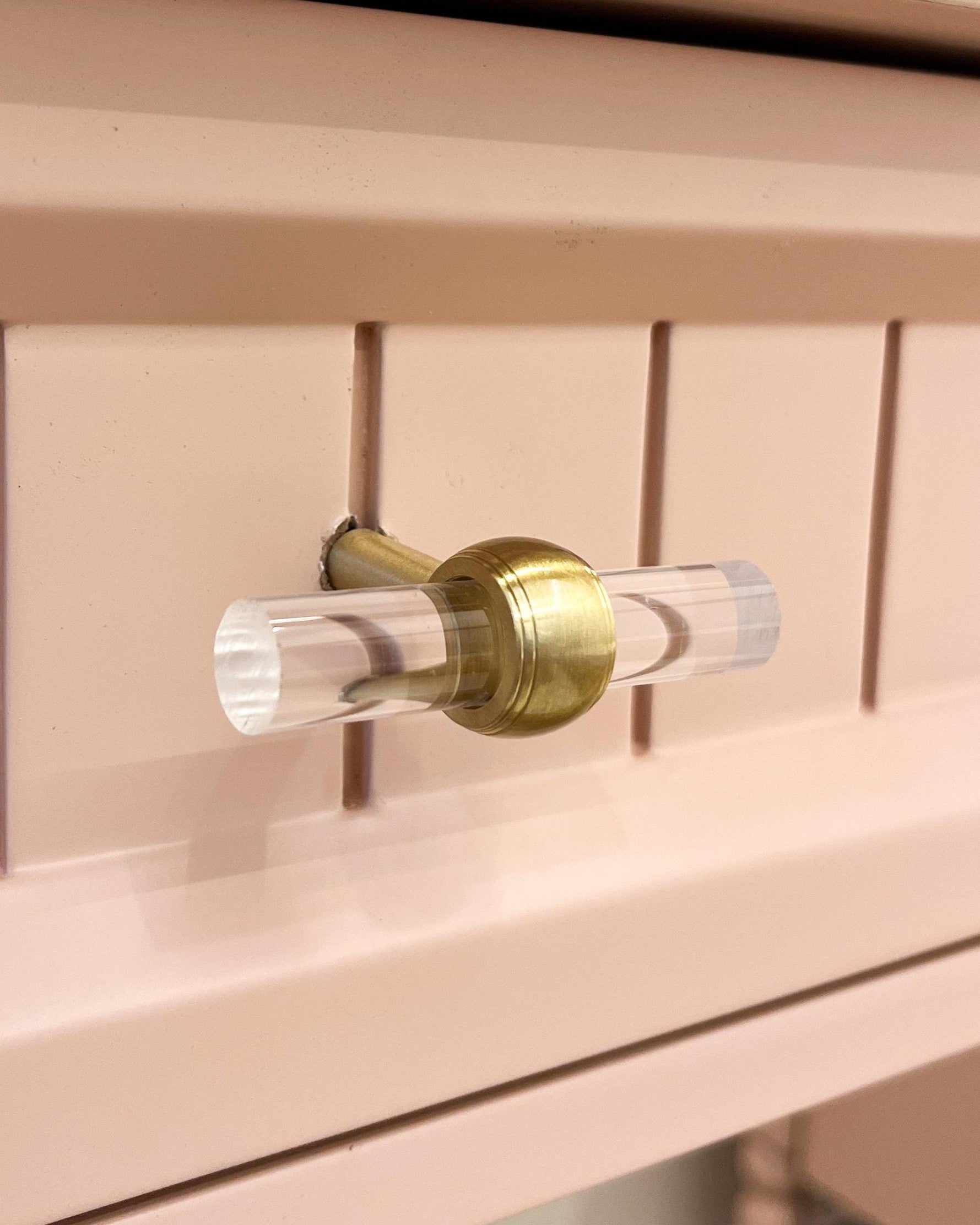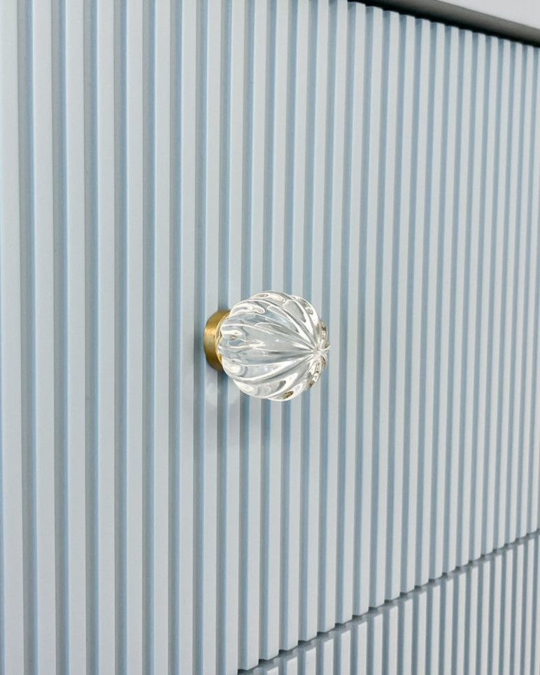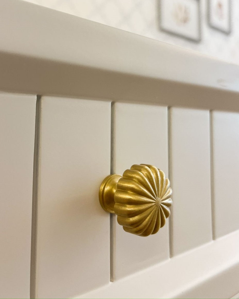 A cômoda e composta por quatro gavetas amplas, ideias para organização, cada uma adornada com puxadores florais que acrescentam um toque romântico e delicado.
