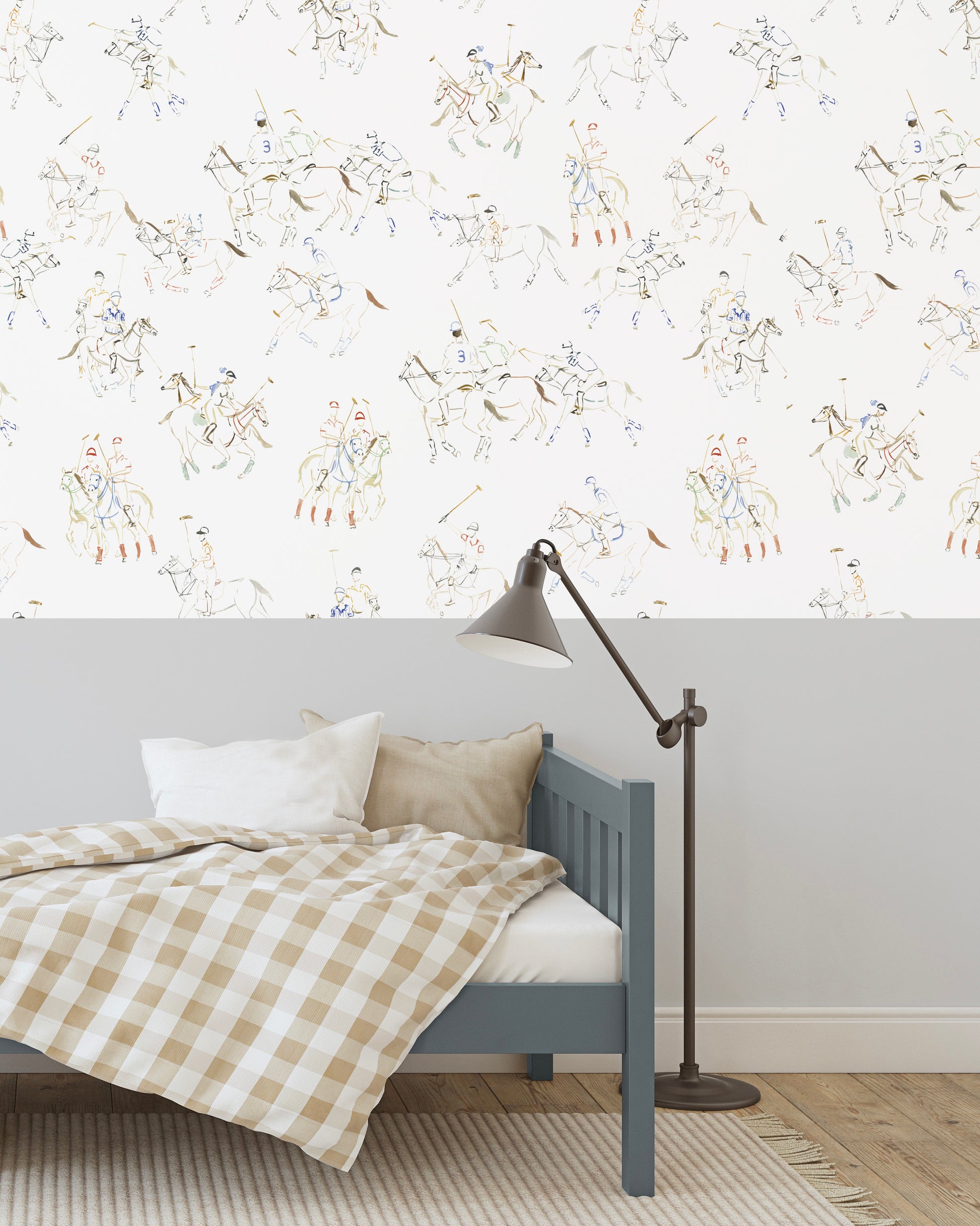 O papel de parede cavaleiros é inspirado no mundo do polo equestre, trazendo uma estética clássica e sofisticada para o ambiente infantil.