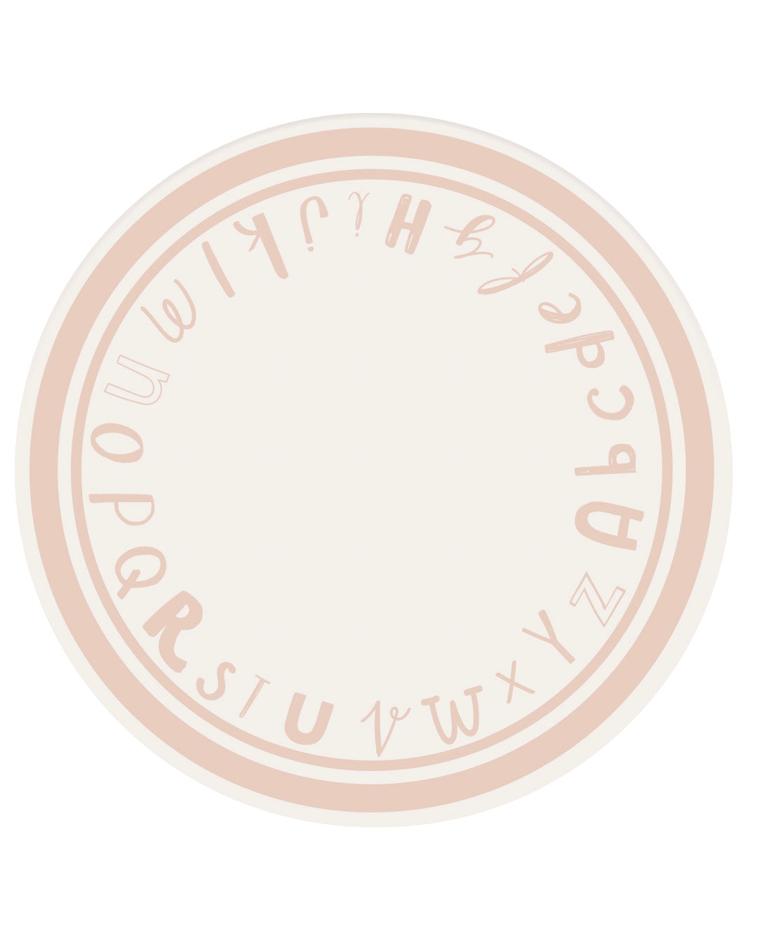 Ele apresenta o alfabeto completo ao redor da borda, em tons suaves de rosa, criando uma peça decorativa que também estimula o aprendizado.