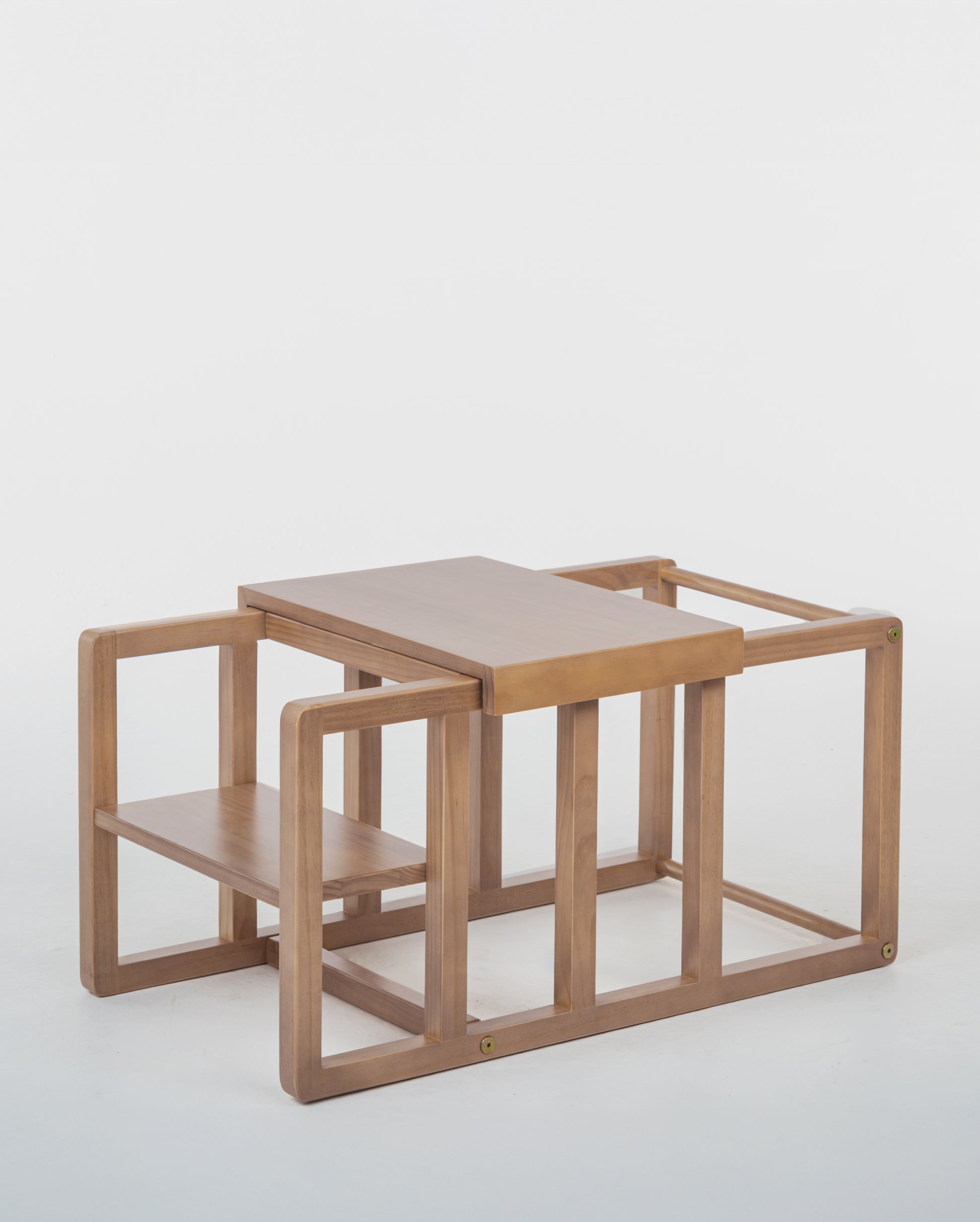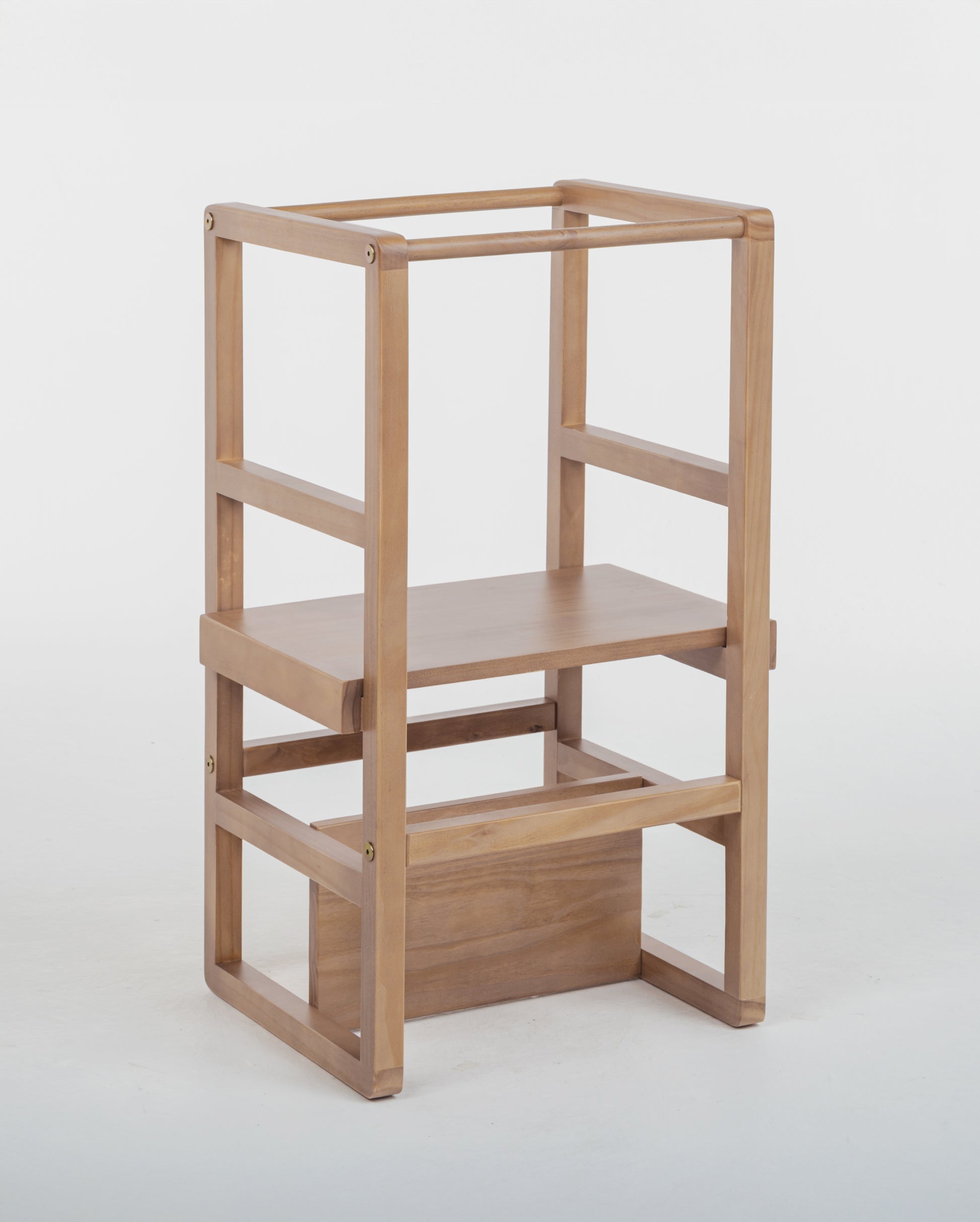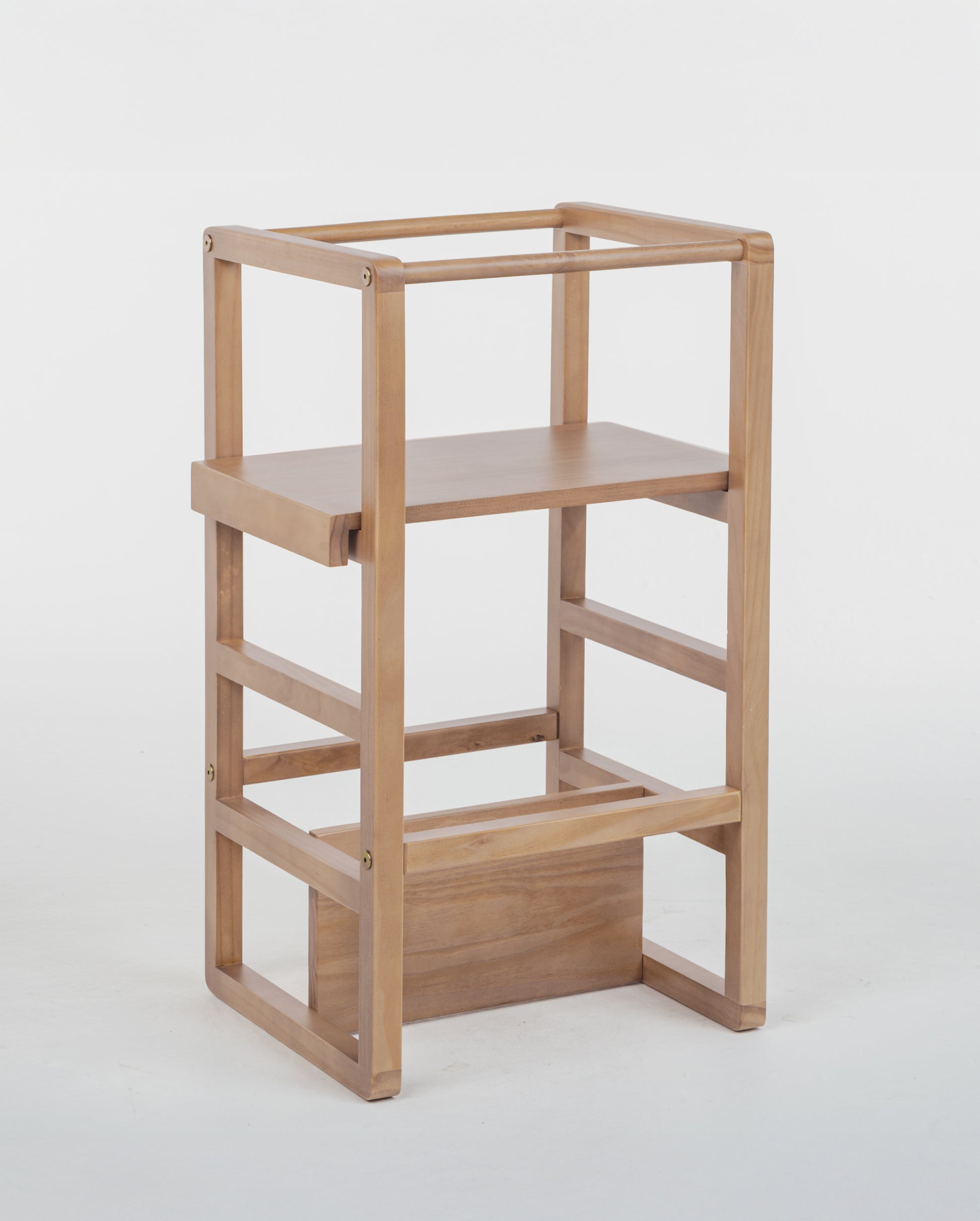 1. Funções Versáteis: Transforma-se em cadeirão, duas torres de níveis para diferentes alturas e uma mesinha para atividades criativas e lanches.