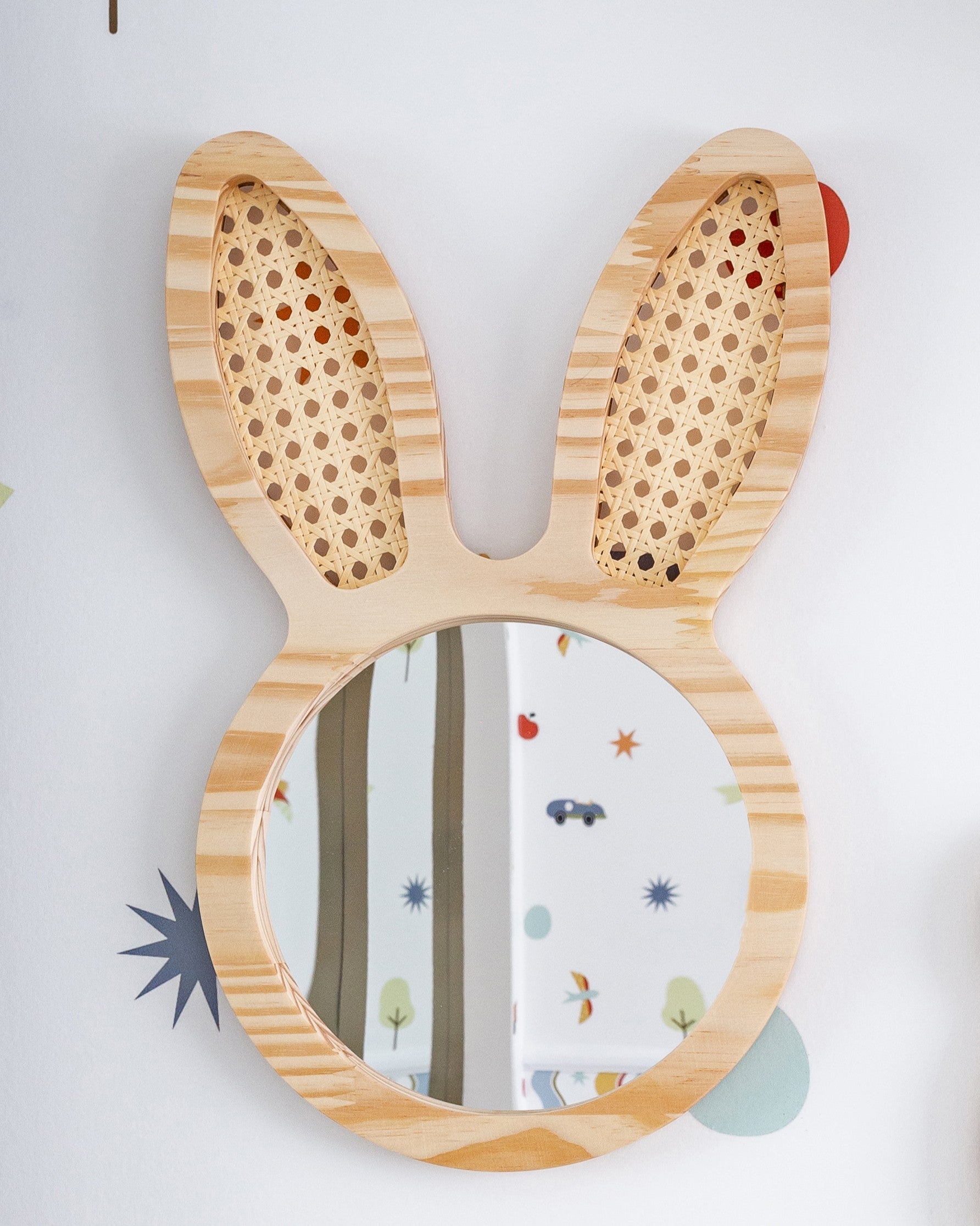 Feito em madeira natural, o espelho tem um formato único de coelho, com orelhas adornadas com palhinha trançada, trazendo um charme rústico e artesanal.
