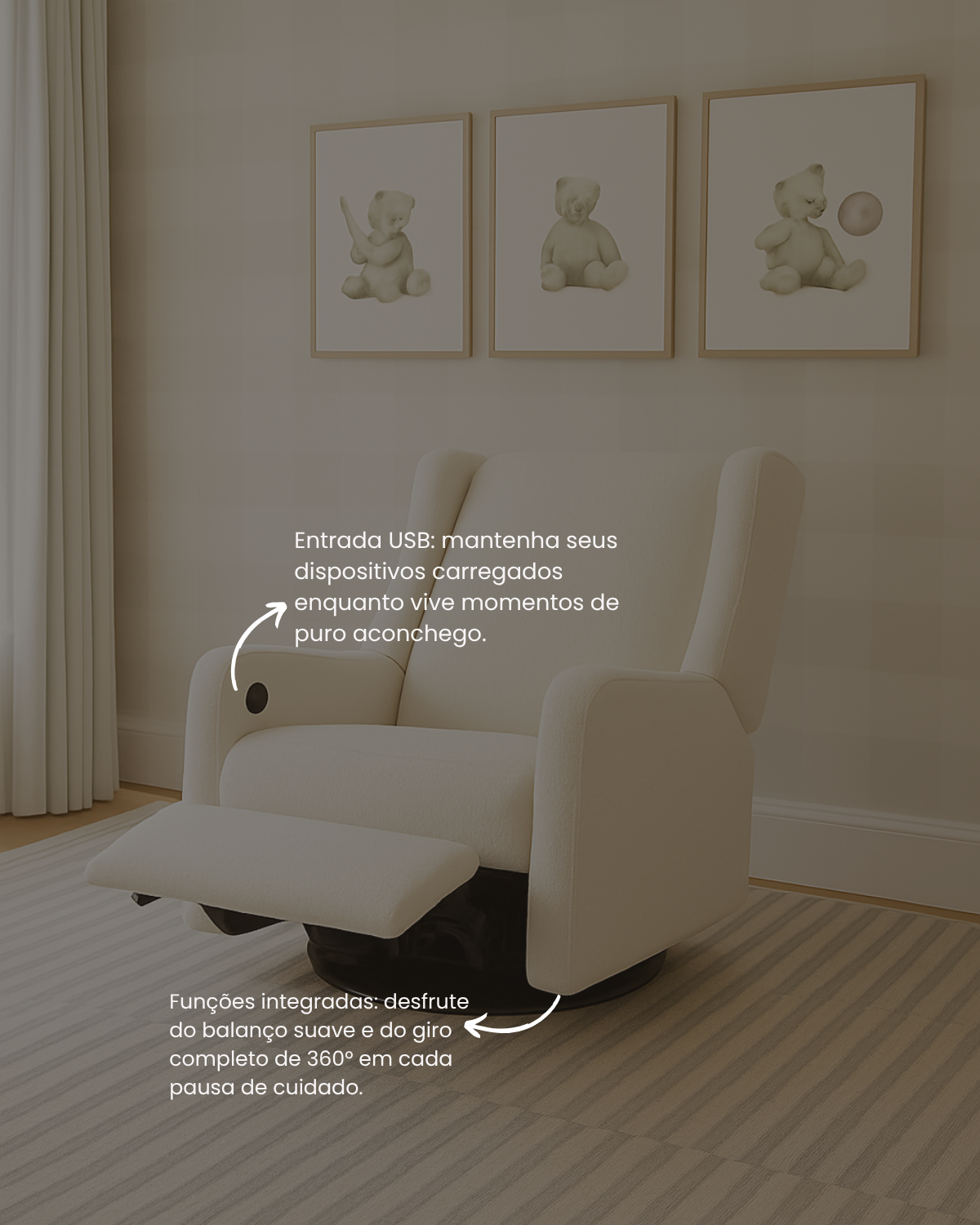 Suas funções integradas balanço deslizante americano, giro 360° e entrada USB facilitam a rotina e proporcionam praticidade ao dia a dia.