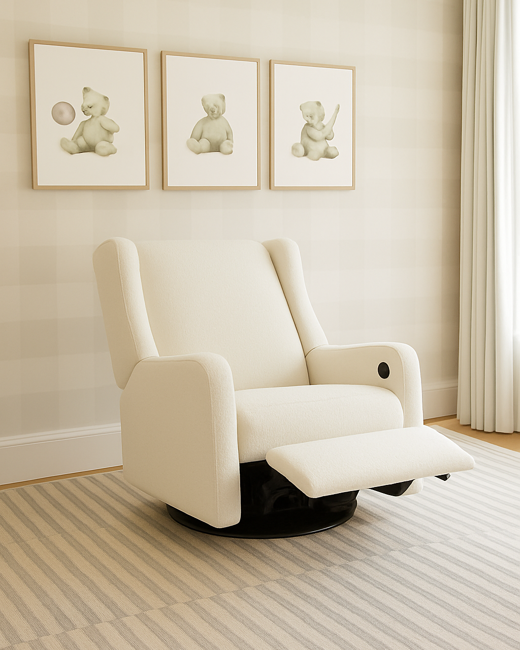 O sistema de balanço deslizante americano é composto por um mecanismo metálico de alta resistência, que combina o movimento de balanço suave com um deslizamento linear para frente e para trás, sem precisar tirar os pés do chão. Ele garante giro estável, silencioso e confortável, ideal para o quarto do bebê e para os momentos de cuidado.