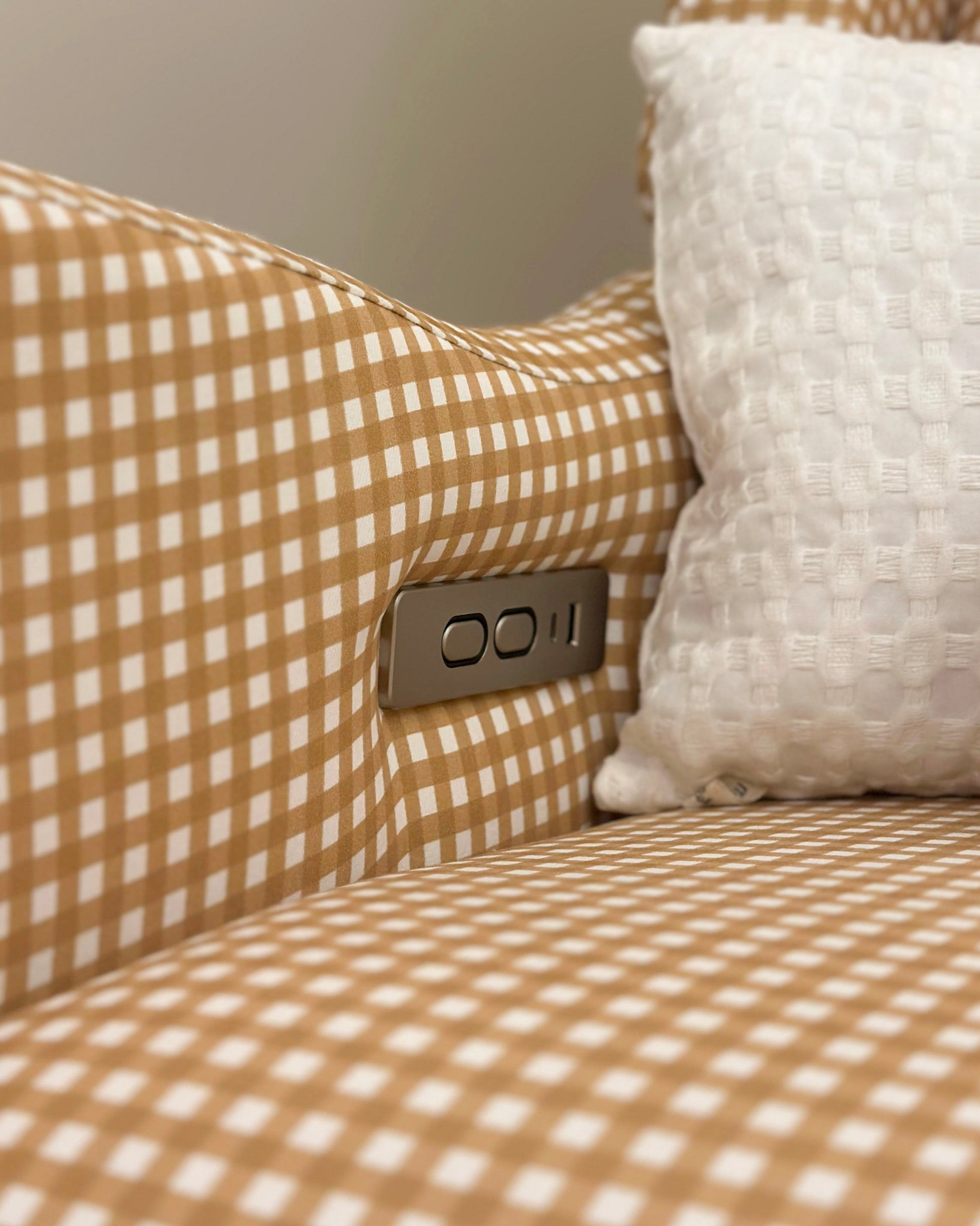 Conta com reclino elétrico com acionamento lateral, permitindo ajustar suavemente o encosto e o apoio de pés.