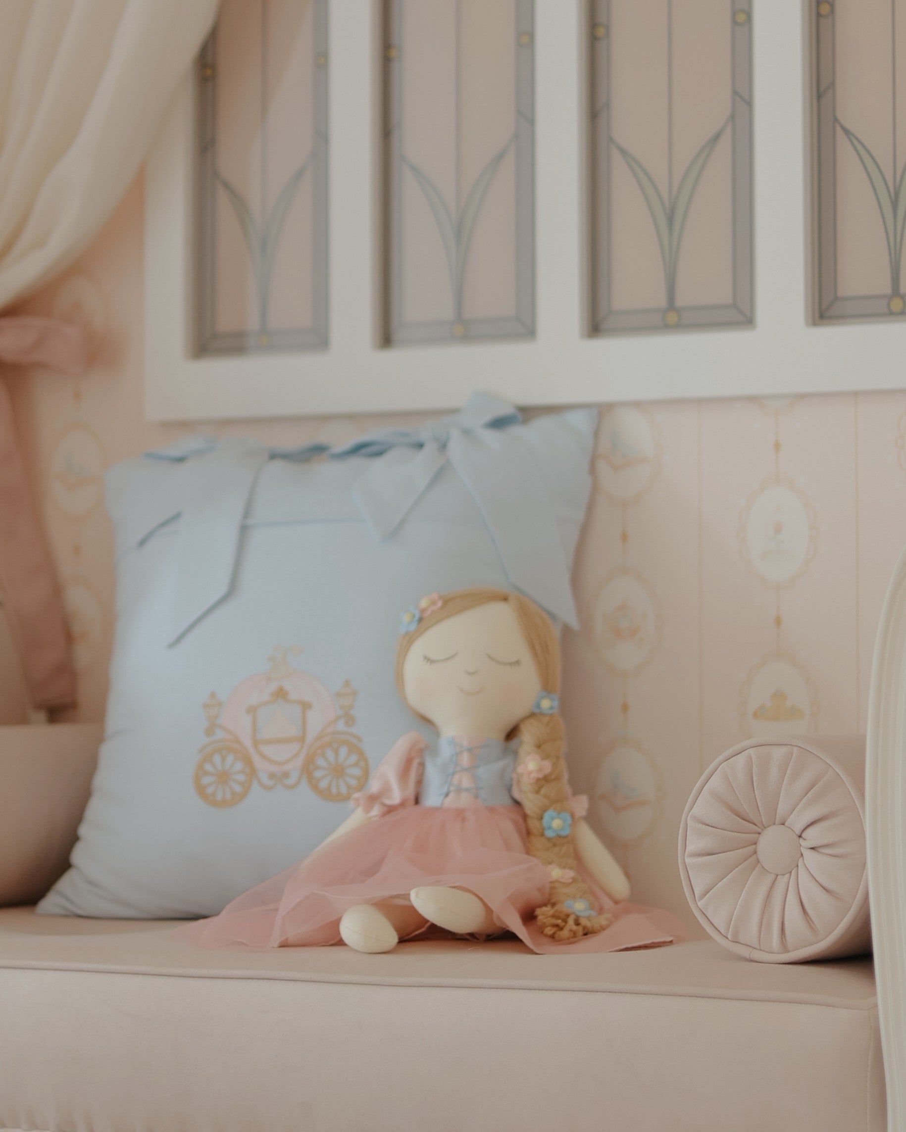 Coloque a Boneca Aurora na cama ou na prateleira para dar um toque de charme ao quarto infantil.