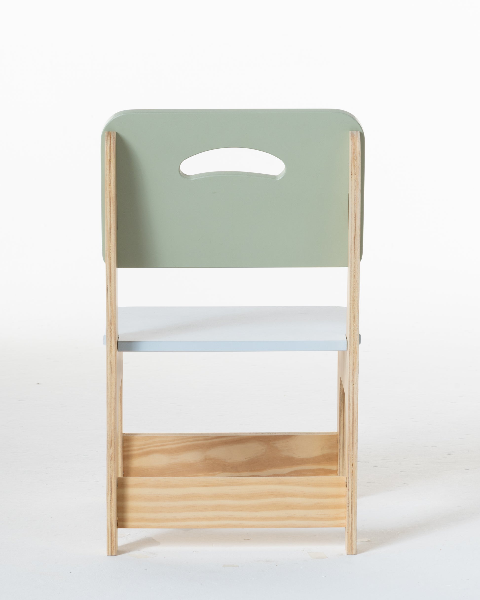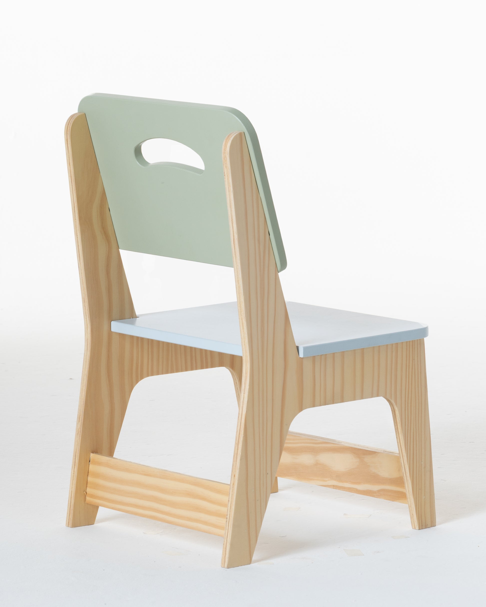 Produzida em madeira maciça, sua estrutura é robusta, acompanhando o crescimento da criança. O encosto ergonômico, com um recorte funcional, permite um manuseio fácil, incentivando a autonomia dos pequenos ao moverem a cadeira com praticidade.