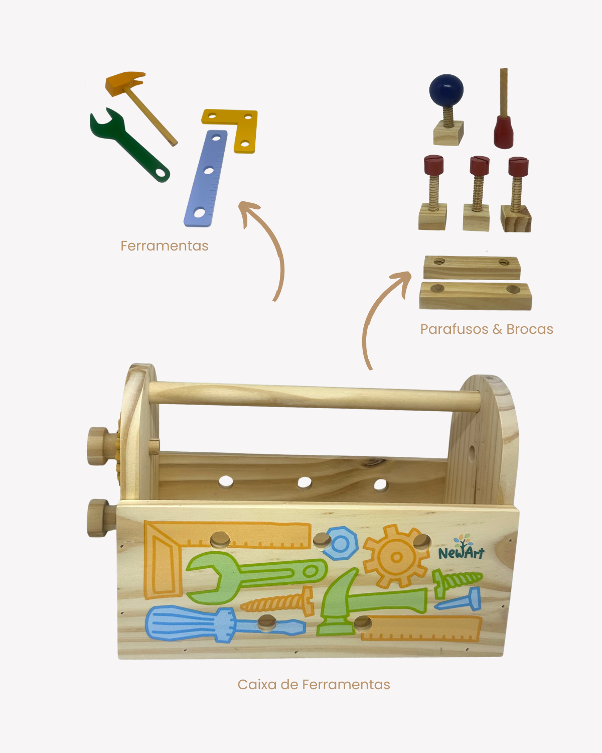 Acompanha ainda uma caixa de ferramentas completa, com peças coloridas em madeira que incentivam o faz de conta e o aprendizado por meio da prática.