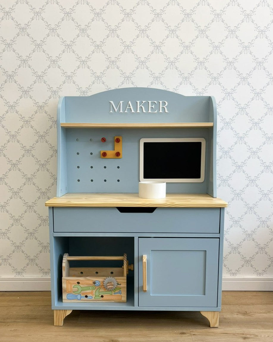 Seu design conta com painel de ferramentas, bancada ampla, lousinha integrada, gaveta funcional e portinha com puxador clássico.
