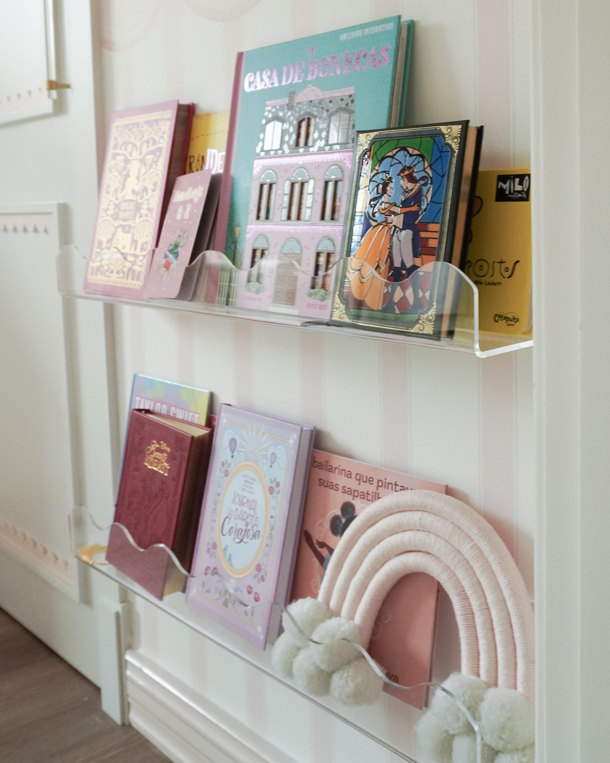 Feita em acrílico transparente, a prateleira apresenta linhas suaves e curvas onduladas que adicionam um charme único à composição. Seu visual clean combina com diferentes estilos de décor do minimalista ao moderno e cria uma sensação de amplitude no espaço. Ideal para livros, pelúcias, vasos ou pequenos adornos.