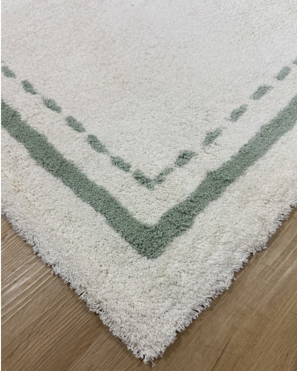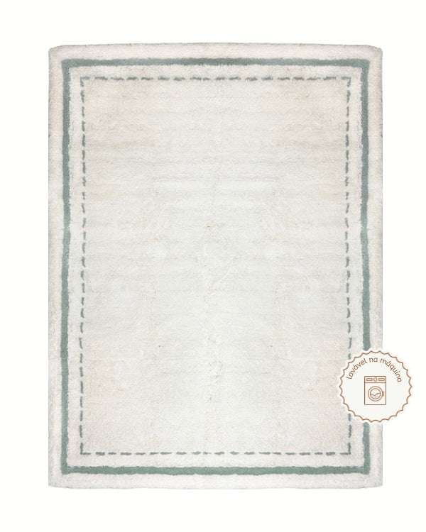 O Tapete Border Verde destaca-se pelo seu design minimalista e elegante, com bordas em tons suaves de verde que enquadram o centro em off-white.